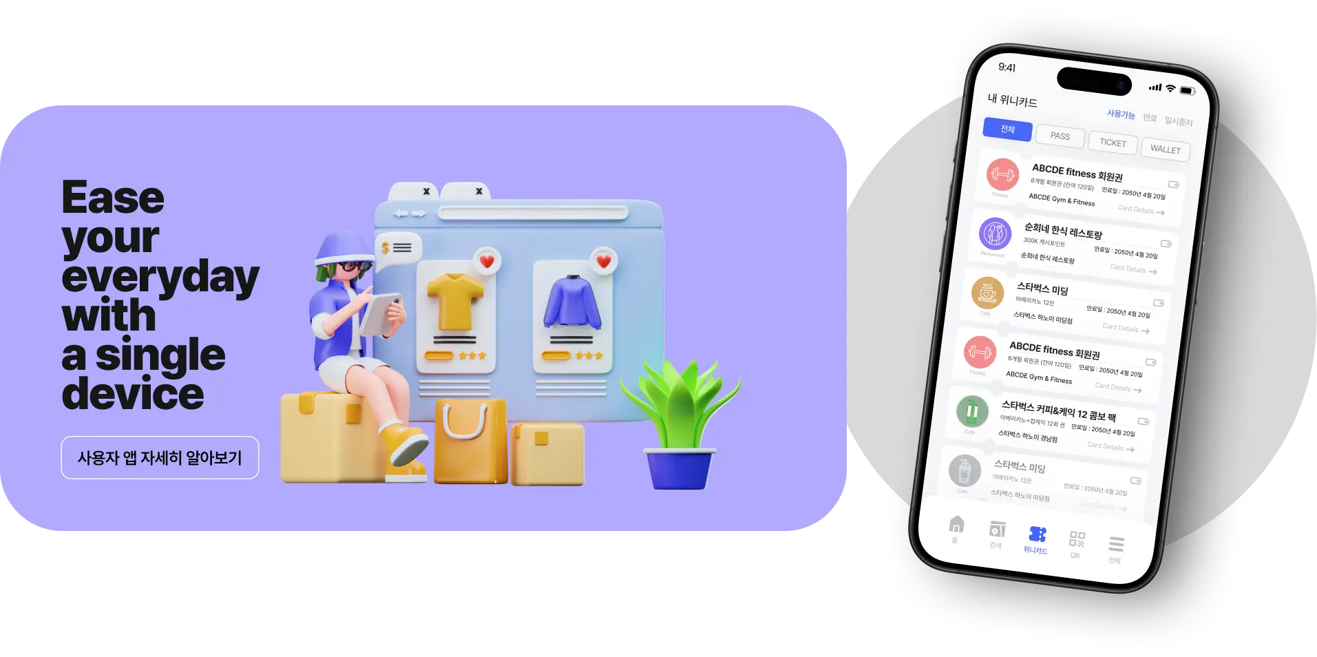 내 휴대폰에서 가장 즐겨찾는 상점과 서비스를 관리하고, 새로운 제품에 대한 소식을 확인 할 수 있어요. 또한, 선 결제로 파격적인 할인 혜택을 누리고, 다양한 리워드 스탬프와 포인트를 선물 받을 수 있어요.